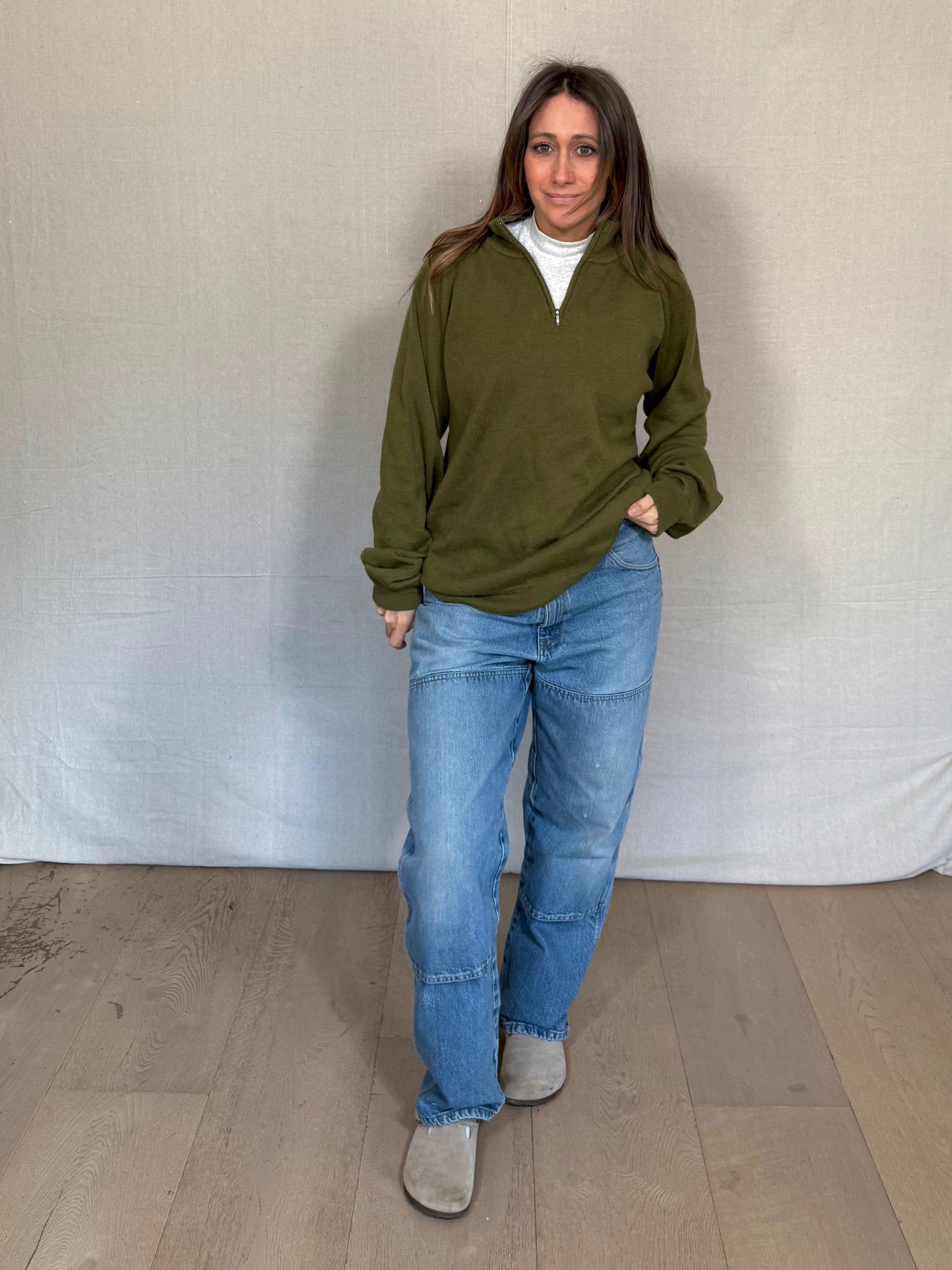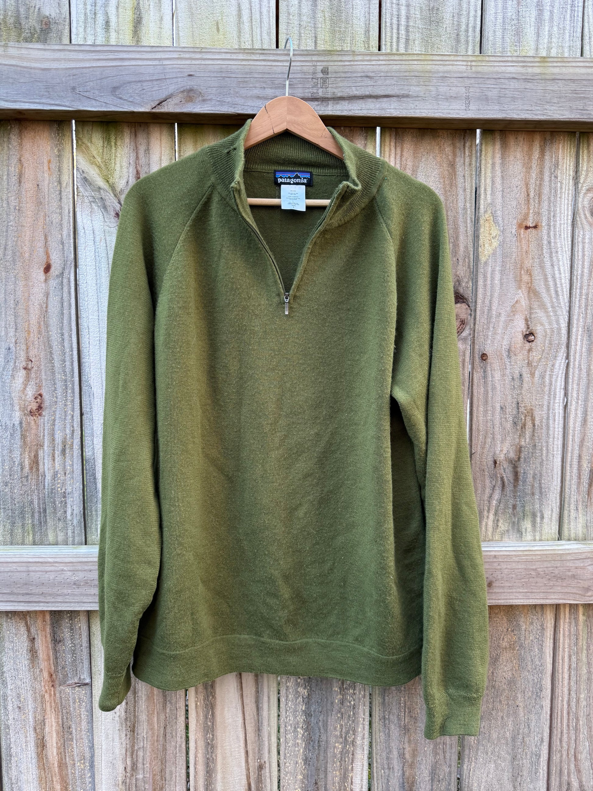 (vintage patagonia, olive wool sweater, quarter zip knit, outdoors style, gorpcore, quiet luxury, earth tones)
