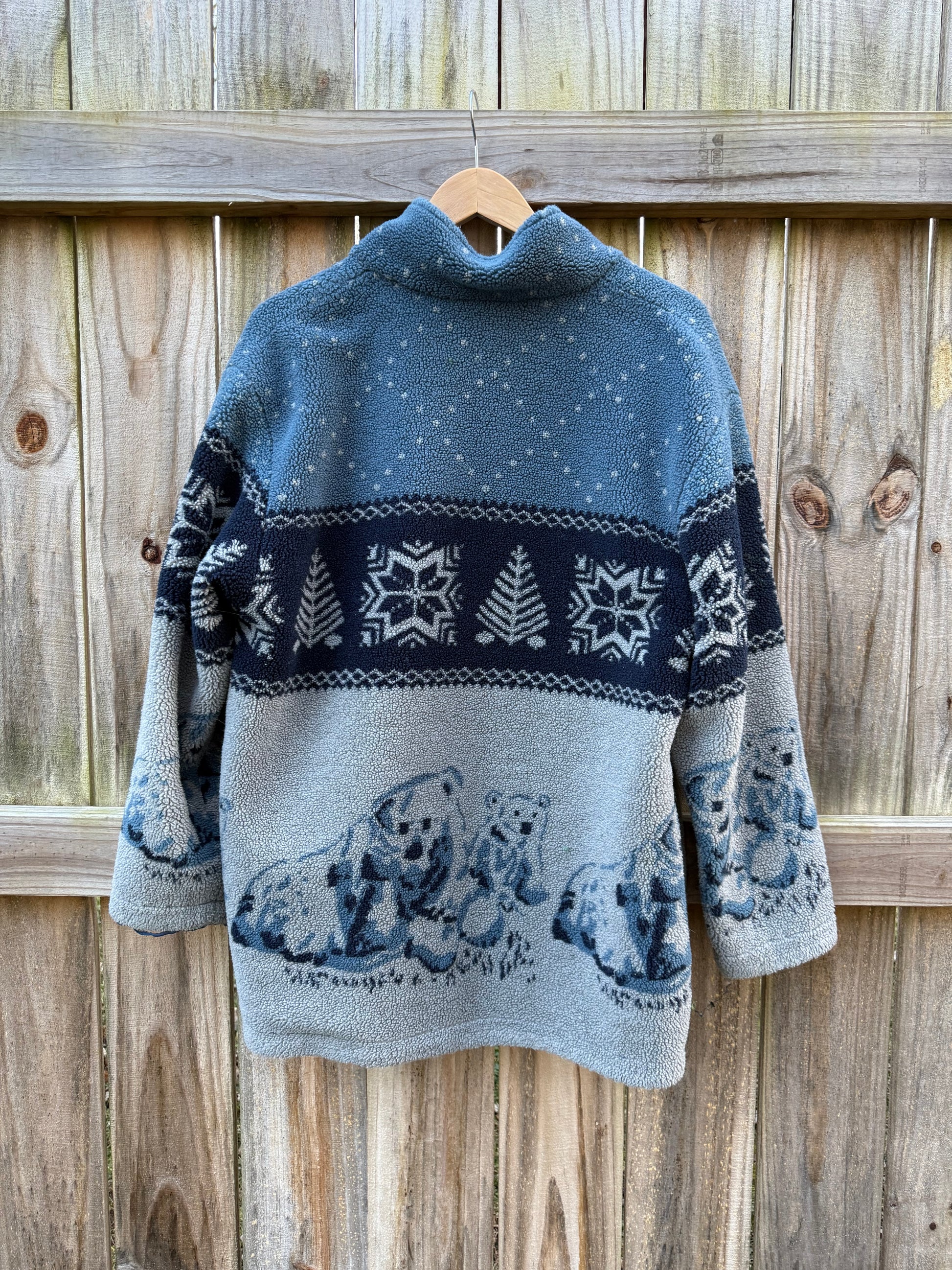 A true standout. Plush fleece zip-up with a full Nordic snowflake band and illustrated polar bears woven through the body and sleeves. Cozy, playful, and genuinely well designed — the kind of vintage that feels collected, not novelty.