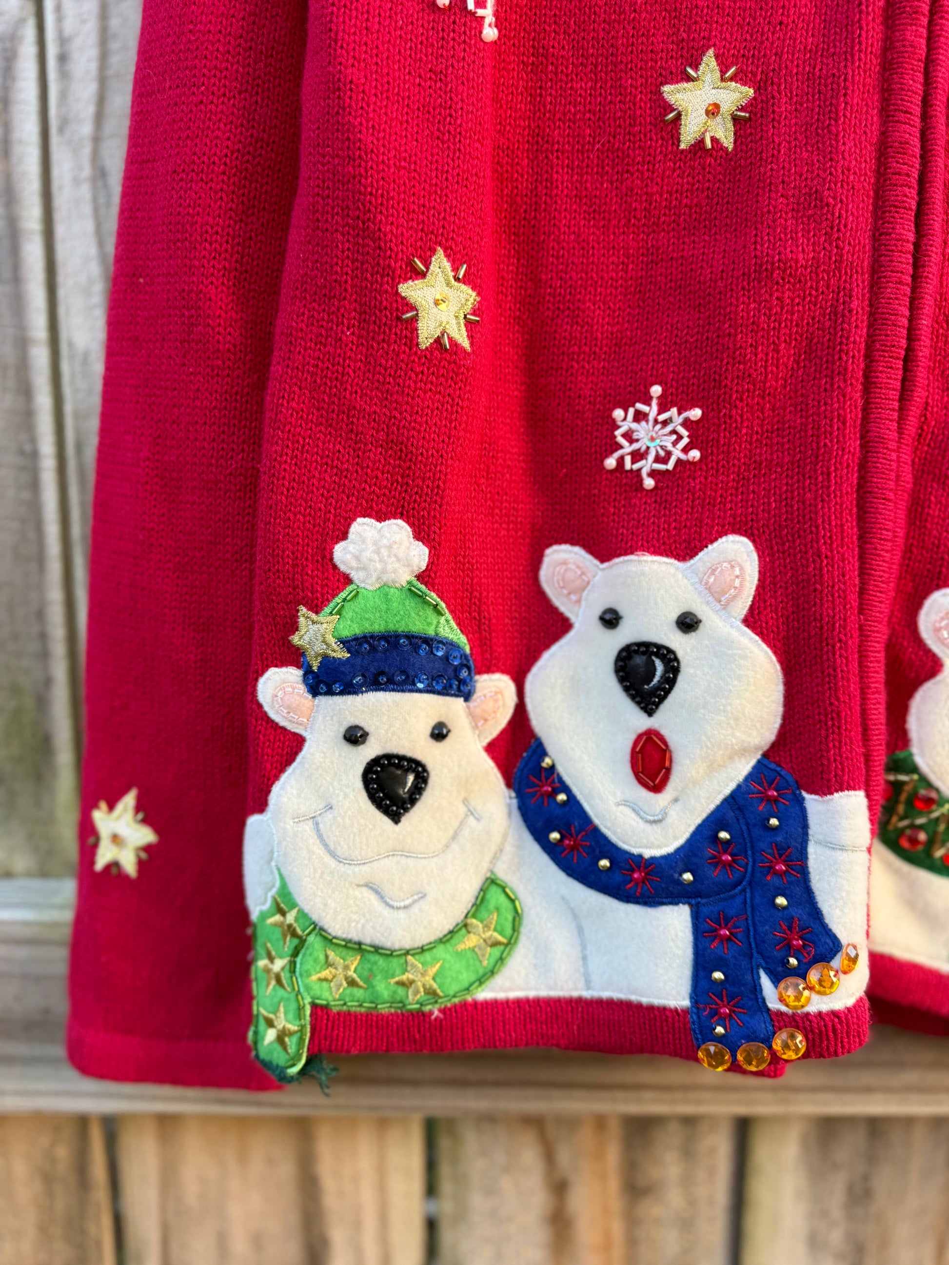 A true statement holiday knit. Bright red with embroidered snowflakes, stitched gold stars, appliqué polar bears in patterned scarves, and a matching felt hat at the zipper pull. Classic Tiara International detailing — playful, intricate, and made to last. It feels like someone’s favorite for years, the kind of piece you find once and keep.