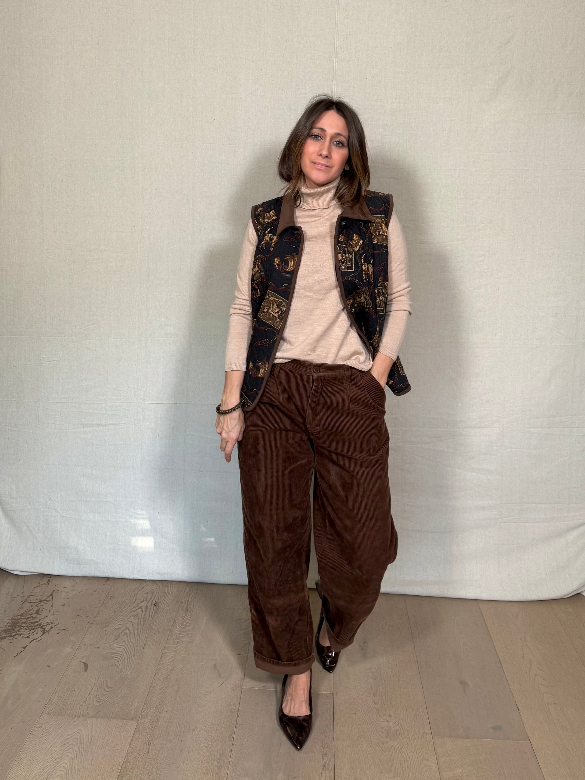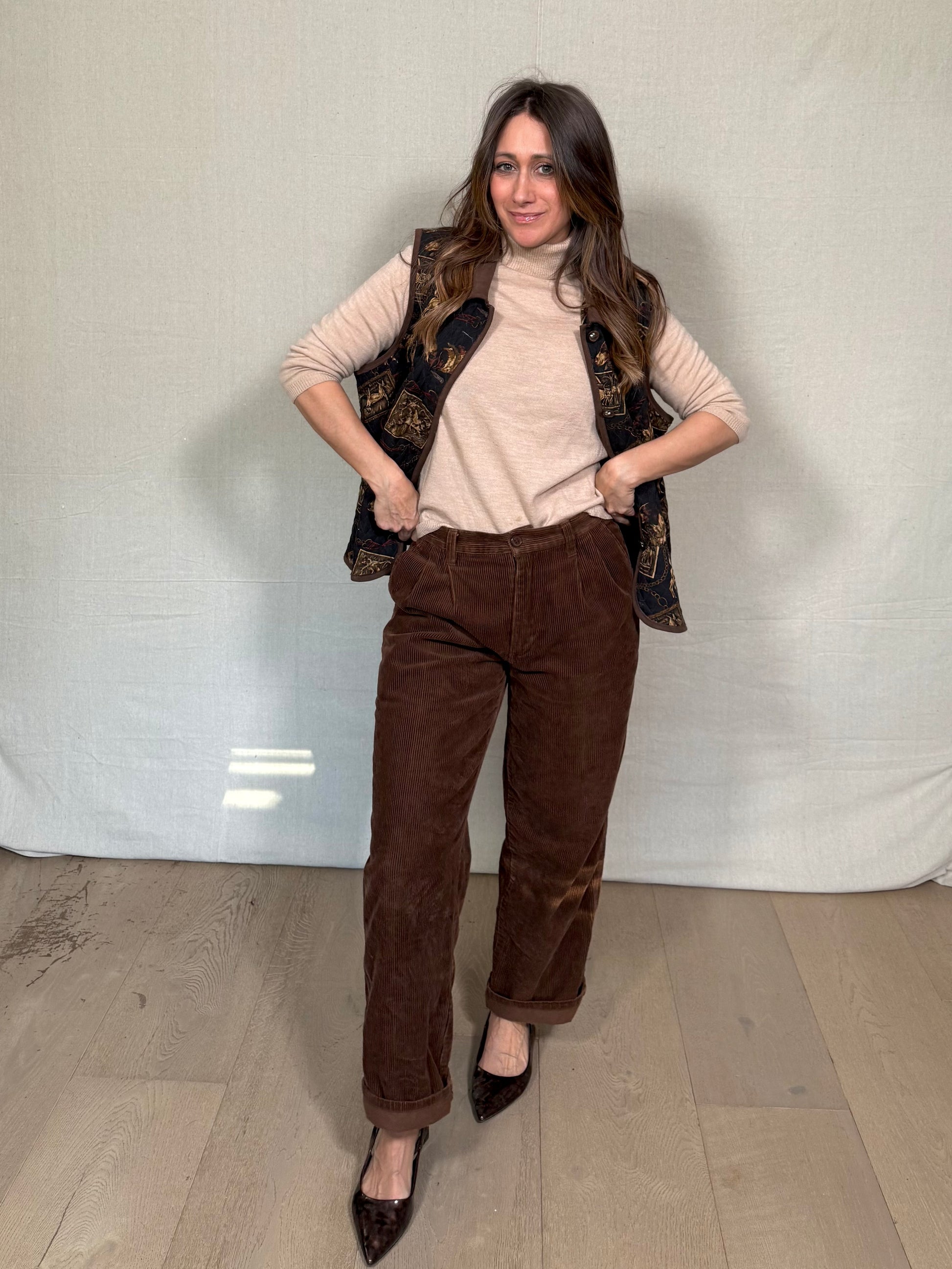 Styled here over a neutral turtleneck and corduroy trousers, it lands in that fashion-editor sweet spot where heritage meets everyday dressing. Also strong over a white tee, ribbed tank, or slim button-down.