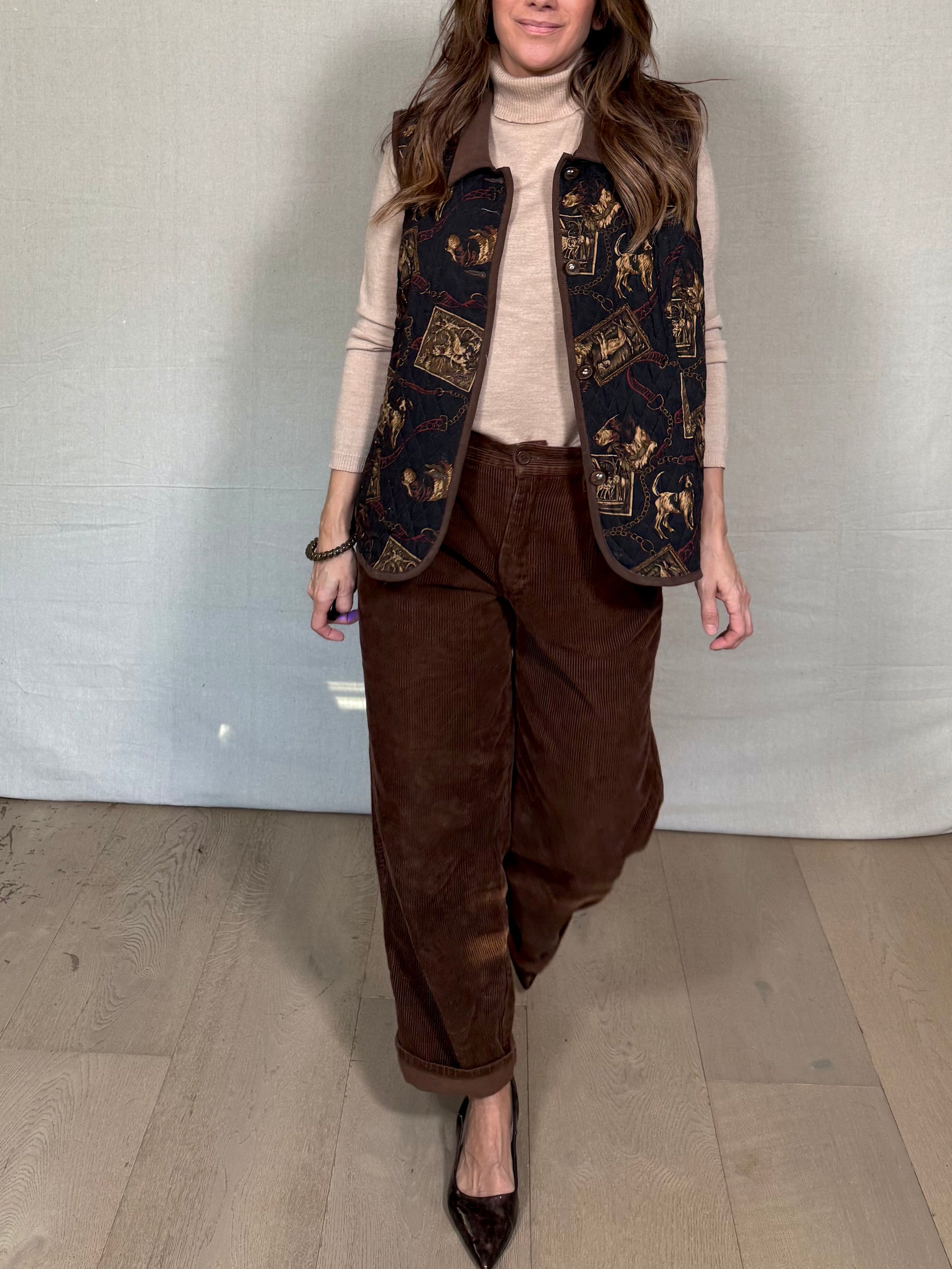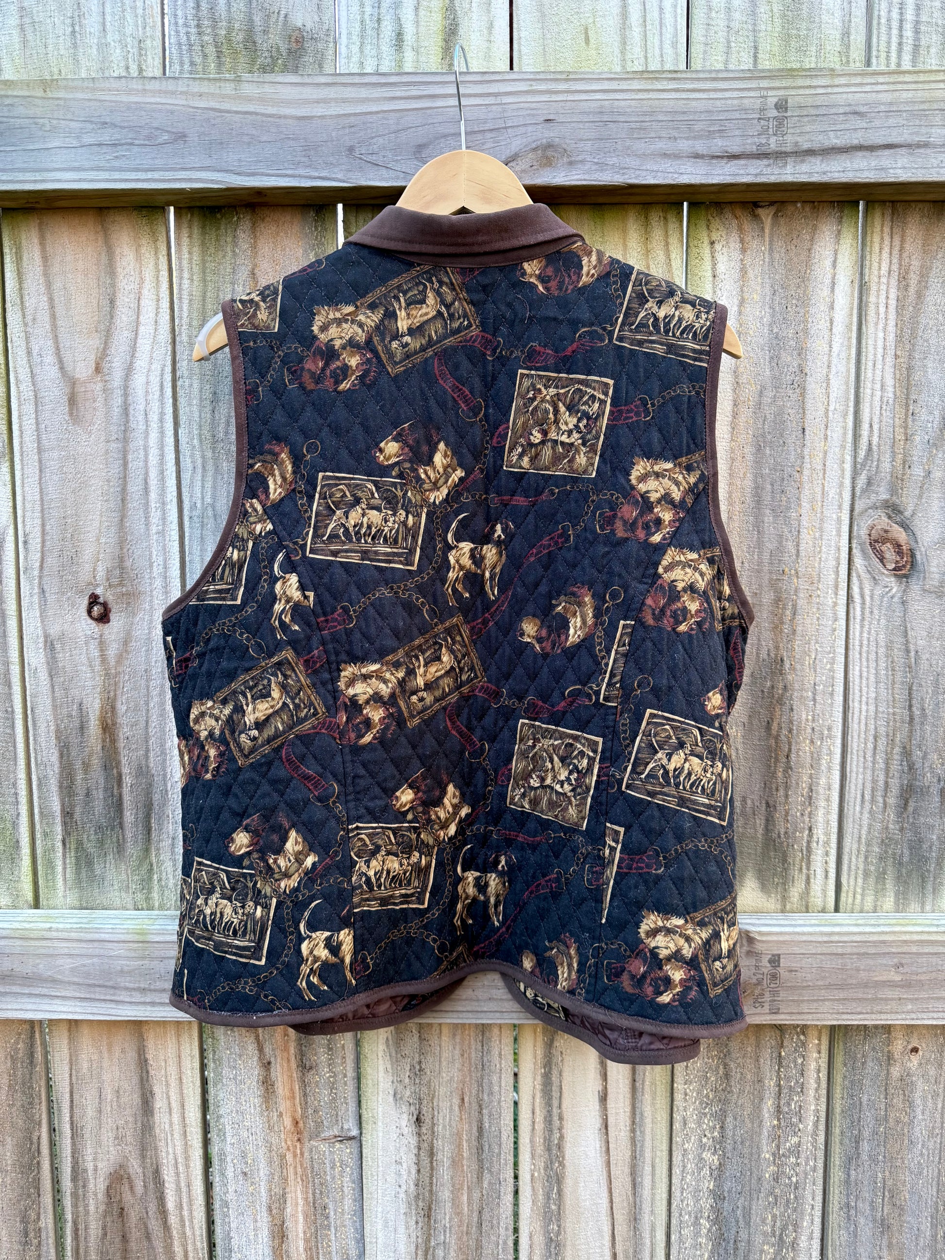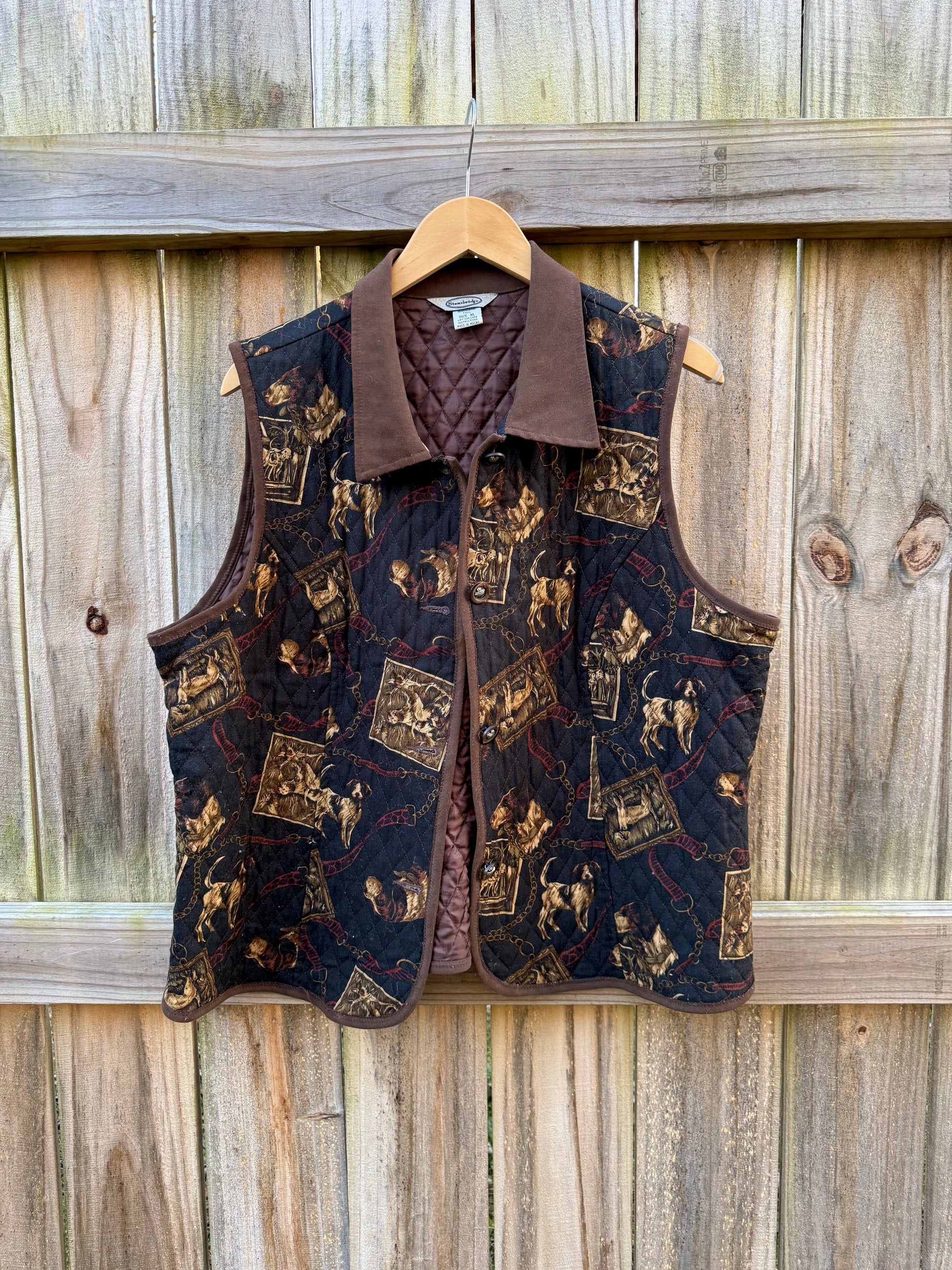 (vintage quilted vest, equestrian print vest, countryside fashion, heritage layering, miu miu style, fashion vest, Stonebridge, Miu Miu, Bode, Ralph Lauren Collection)
