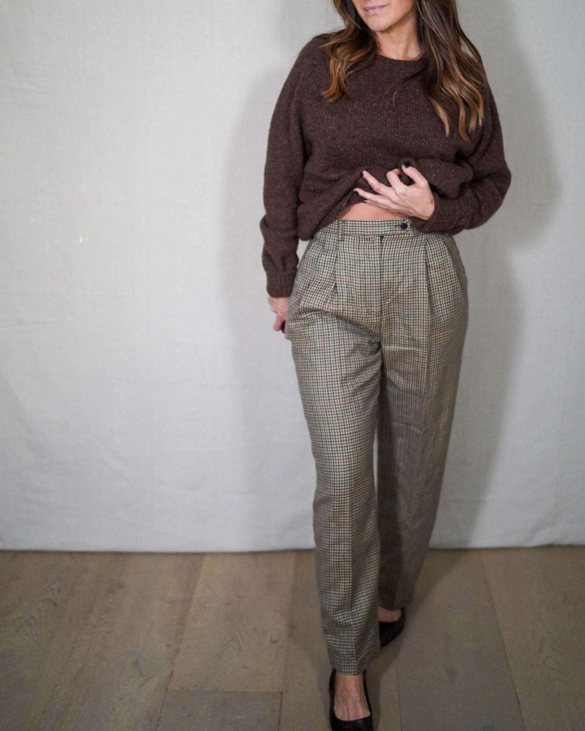 A classic wool check trouser with a shortened, deliberate hem — the kind of proportion that shows up again and again in quiet European tailoring and late-90s minimalist wardrobes.