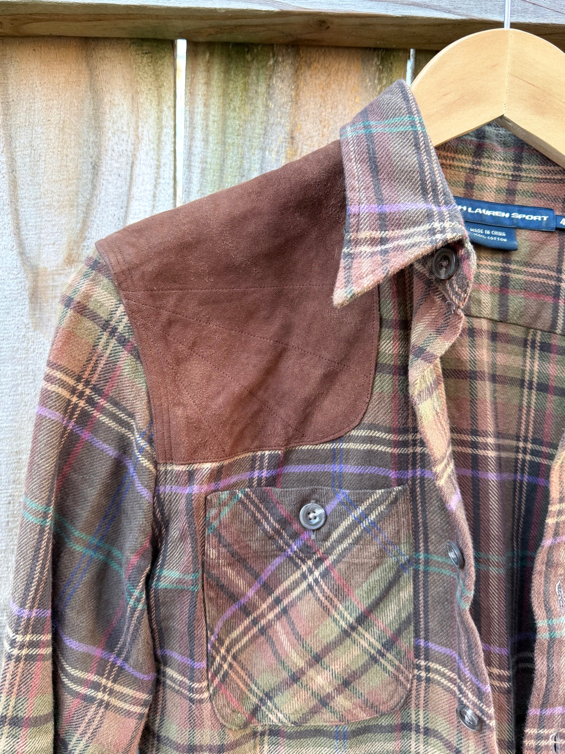 Vintage Ralph Lauren Sport Plaid Flannel Shirt with Suede Shoulder Patch