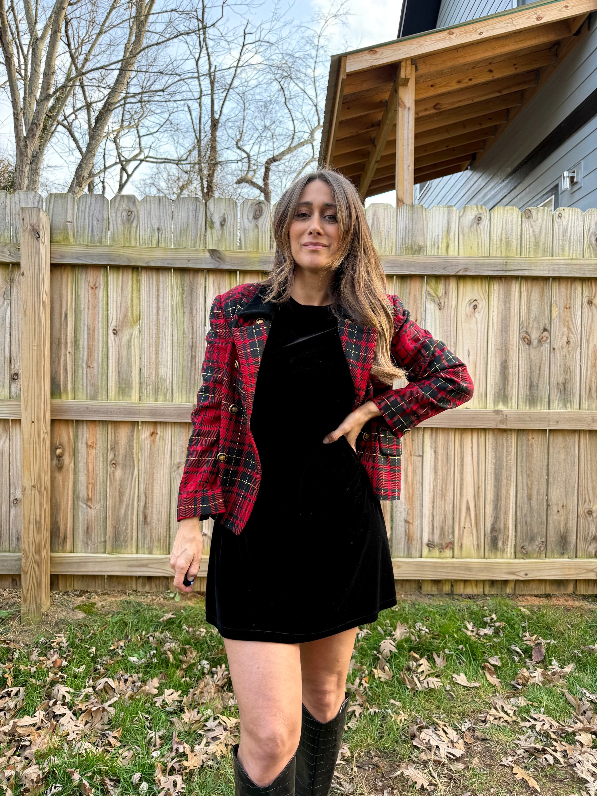 (tartan blazer, holiday blazer, wool blazer, velvet collar, downtown winter, Sandro, Maje, Veronica Beard)