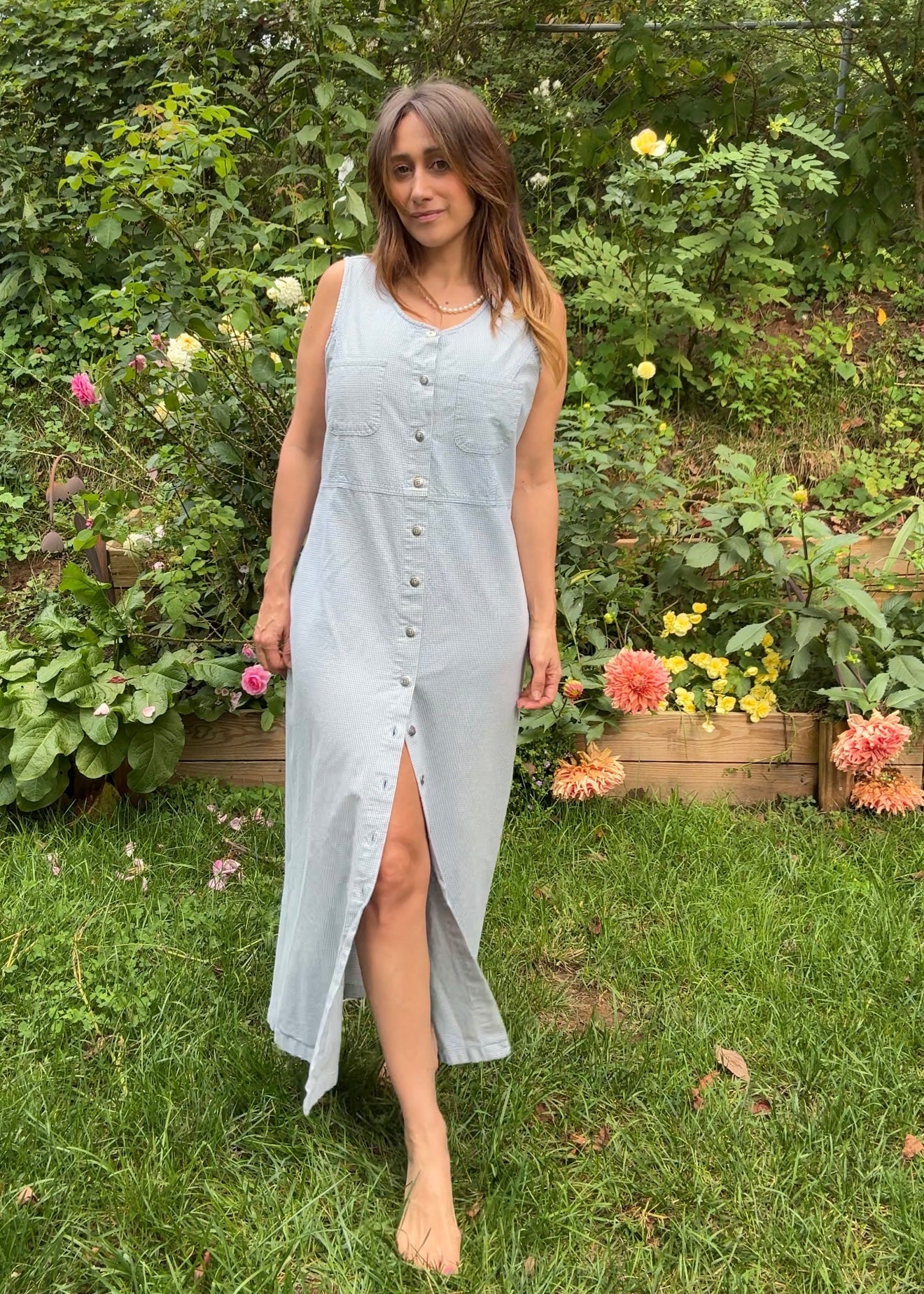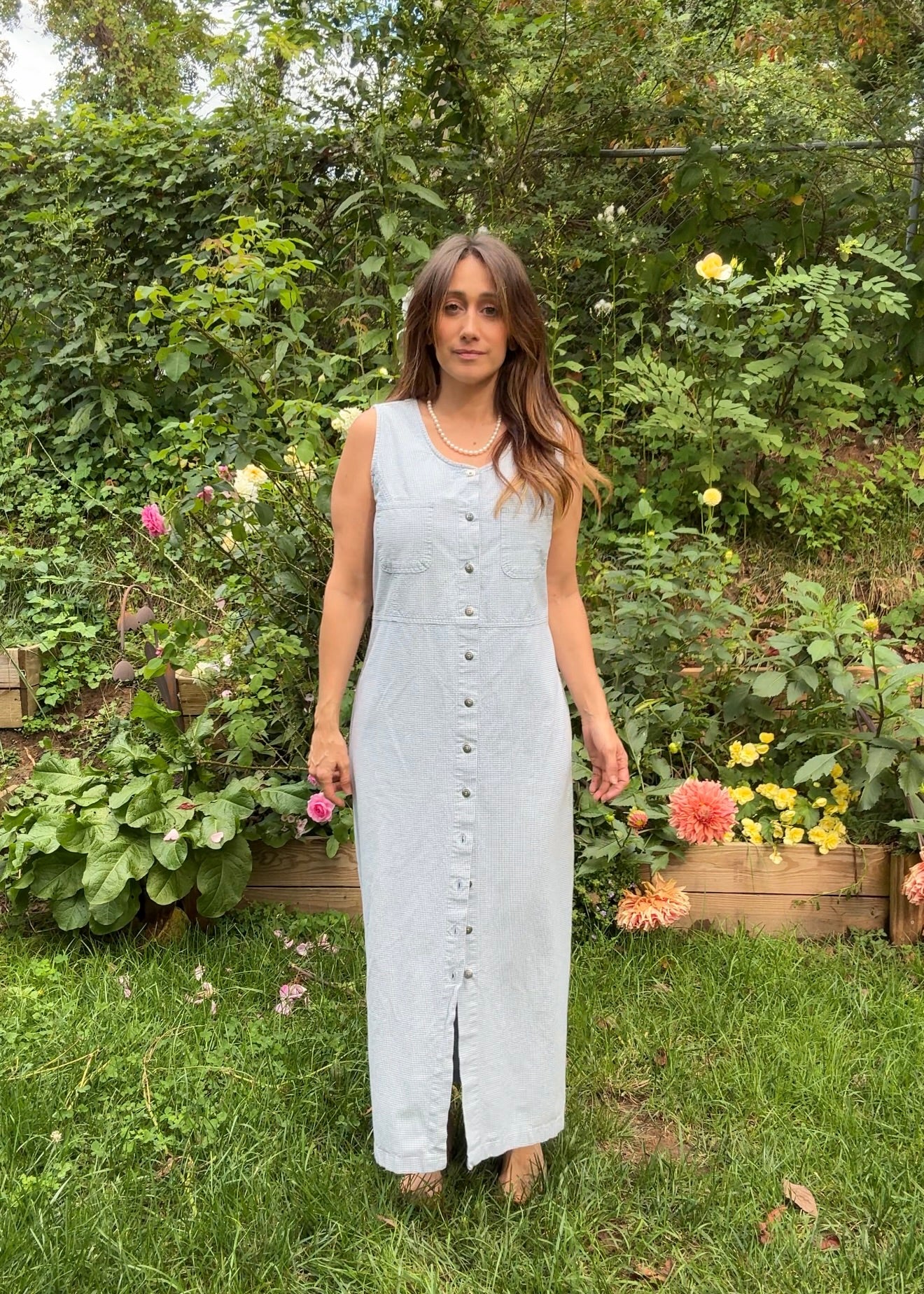 I reworked this vintage piece into a clean 90s column silhouette — straight lines, button details, and structured fabric that holds its shape while still feeling soft from age. It’s got that quiet-luxury minimalism that’s trending now. Very Reformation vibe, but thrifted.