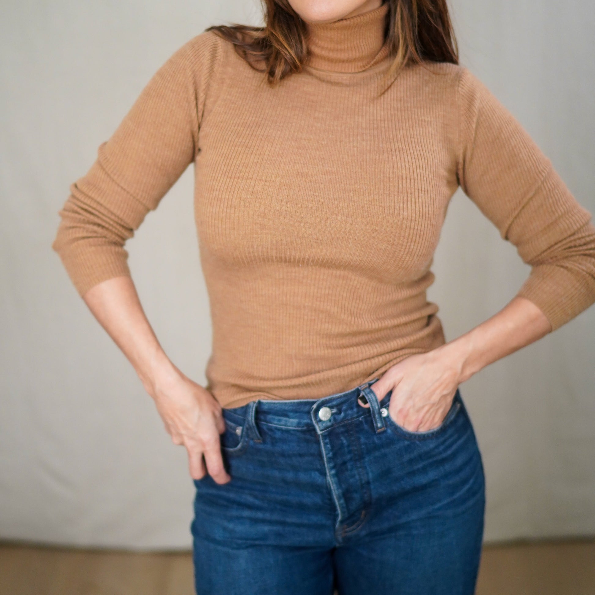 (vintage ribbed turtleneck, camel knit top, quiet luxury basics, minimalist layering, 90s inspired essential; Toteme, Khaite, The Row)