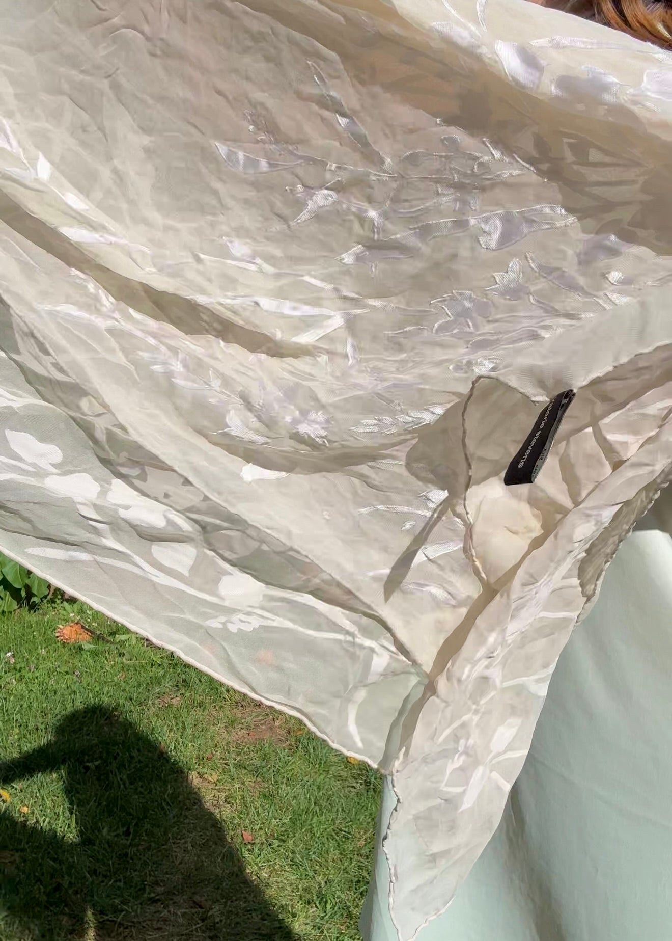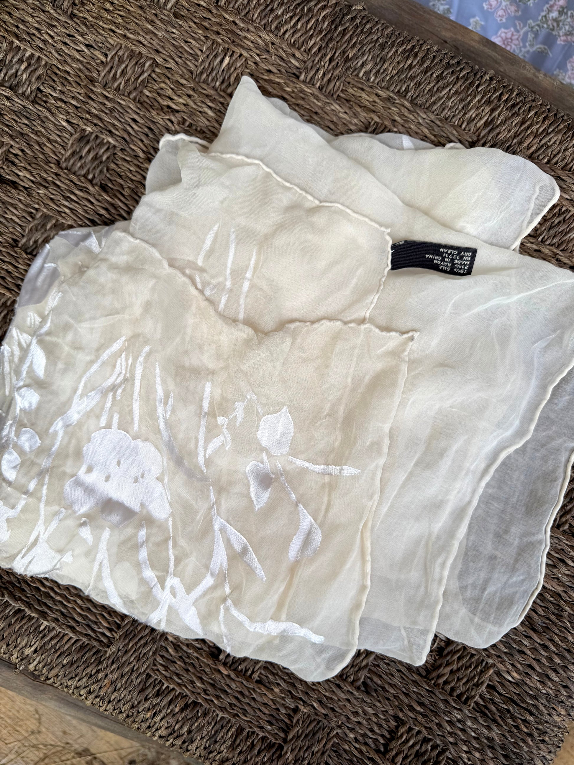 Sheer vintage Valerie Stevens scarf in ivory with a delicate tonal floral burnout. Long rectangle cut so you can wear it endless ways—draped, wrapped, or styled like a Juliet veil for that ethereal, almost bridal vibe.