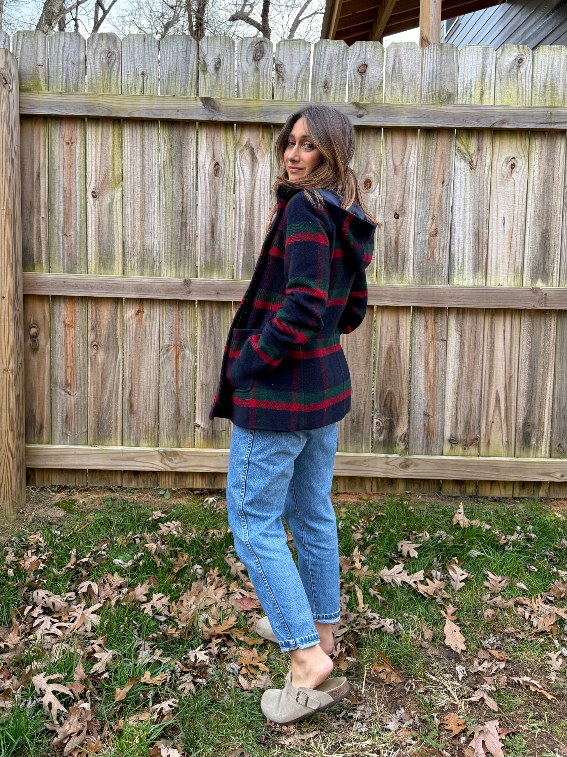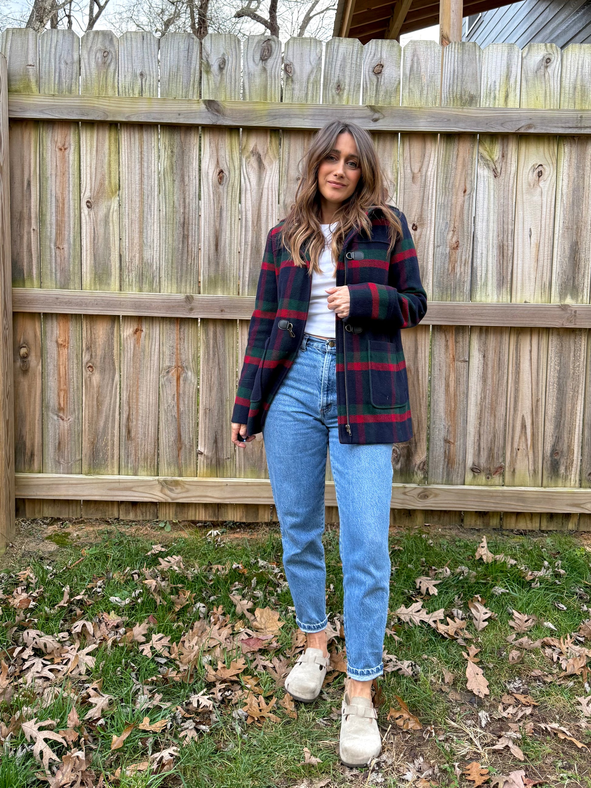 This is that classic preppy-meets-’90s outerwear moment: a navy, red, and forest-green plaid coat with the perfect boxy cut and real weight to it. Warm, structured, and surprisingly current — this could walk straight into a KULE or Alex Mill lookbook and no one would blink.