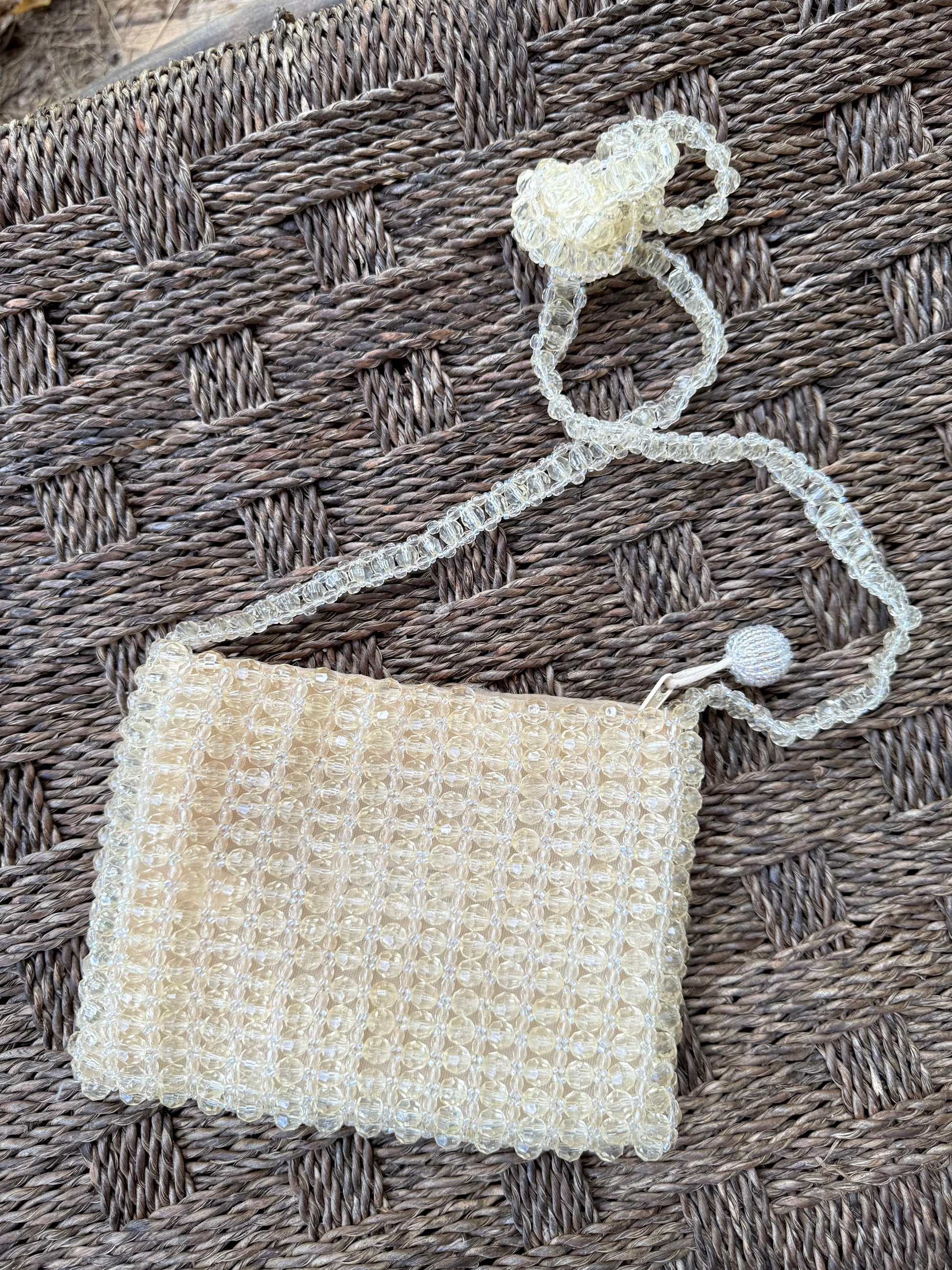 Details: All-over beading, long beaded strap, inner zip pocket
