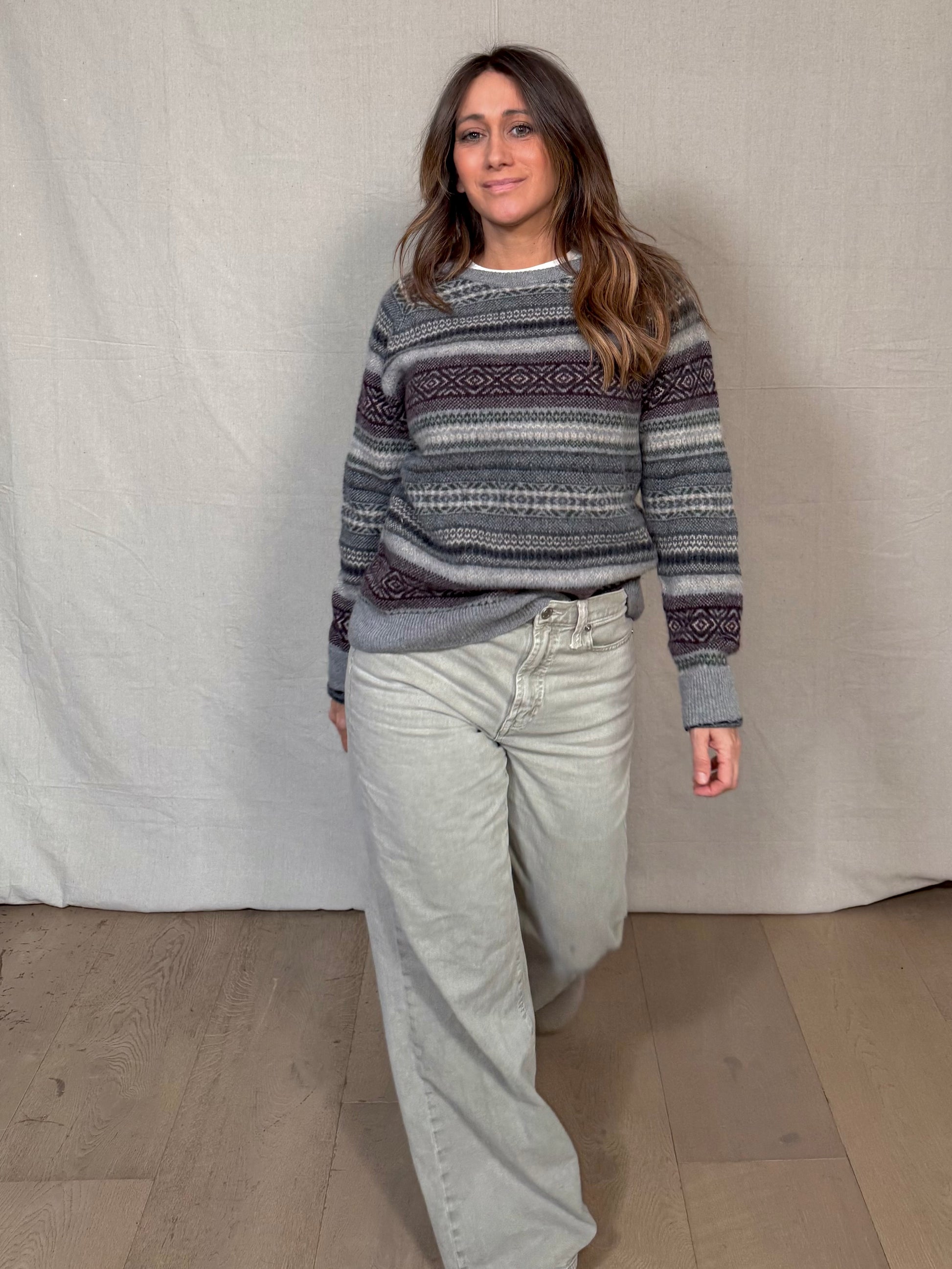 A true cold-weather classic. Soft wool knit with muted Fair Isle striping that feels straight out of an old ski lodge or a 90s winter catalog. The palette is what sells it — smoky greys, muted plum, soft olive — grounded, wearable, and very now.