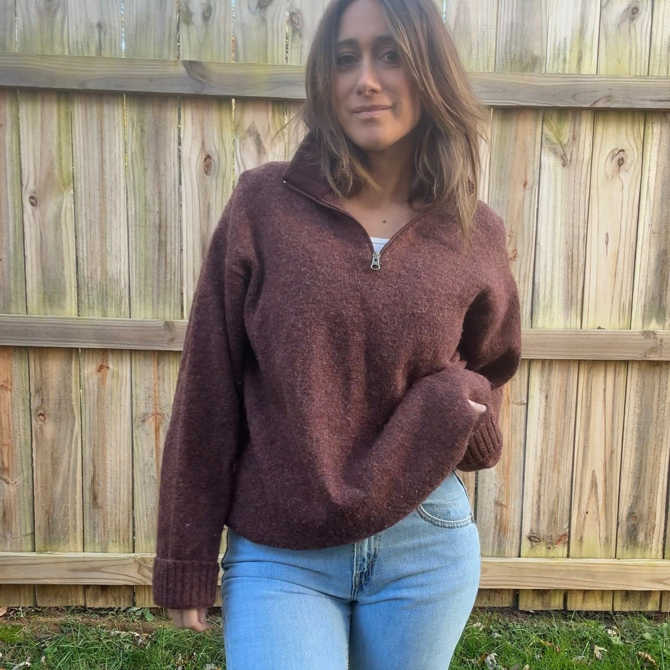 (wool zip sweater, brown half zip, heritage pullover, cozy woolrich knit, Patagonia, LL Bean, Pendleton)